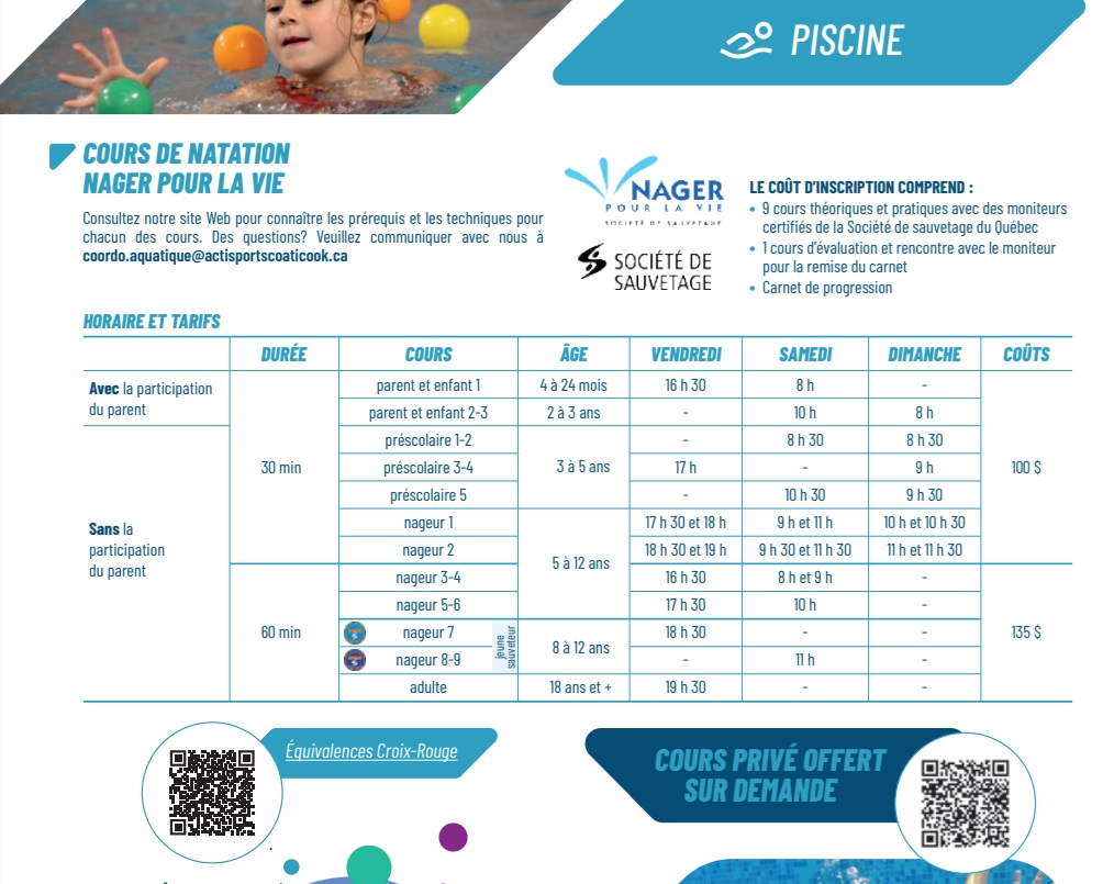 Pour toutes questions concernant le niveau approprié pour votre enfant, veuillez consulter la page suivante ou communiquez avec notre coordonnatrice aquatique.